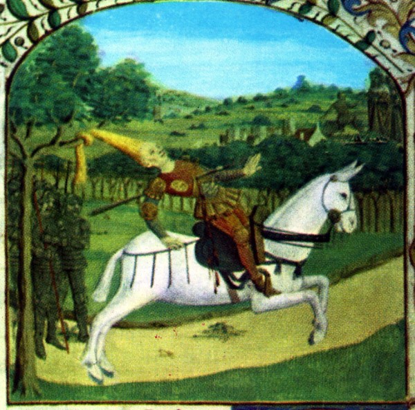 Da notare che Fioravante indossa il tipico equipaggiamento dei milites normanni negli anni del regno di Ruggero II d’Altavilla: corazza in maglia di ferro (cotta d’arme o usbergo) senza cappuccio, elmo conico privo di nasale, scudo a forma di mandorla, lancia di tipo pesante senza pennoncello (stendardo).