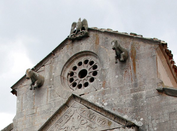 La facciata, in pietra grigia locale, a salienti, si svolge in due zone: nella superiore stanno il rosone, con oculo centrale e una raggiera di altri 12 fori più piccoli (figurazione di Gesù e degli Apostoli), due grosse protomi bovine (esemplificano Cristo sacrificato) che fuoriescono dal muro con le zampe penzolanti, un’aquila (simbolo della resurrezione dell’anima: si riteneva che, morta, precipitasse nelle acque di un fiume per poi rinascere) posta alla sommità; nell’inferiore spicca l’elegante pseudoprotiro di tipo pugliese - riccamente decorato con motivi vegetali, bizzarre effigi umane, animali reali e fantastici - preceduto da una gradinata che si eleva fino all’altezza dello zoccolo e affiancato da due archi ciechi con lunette scolpite.